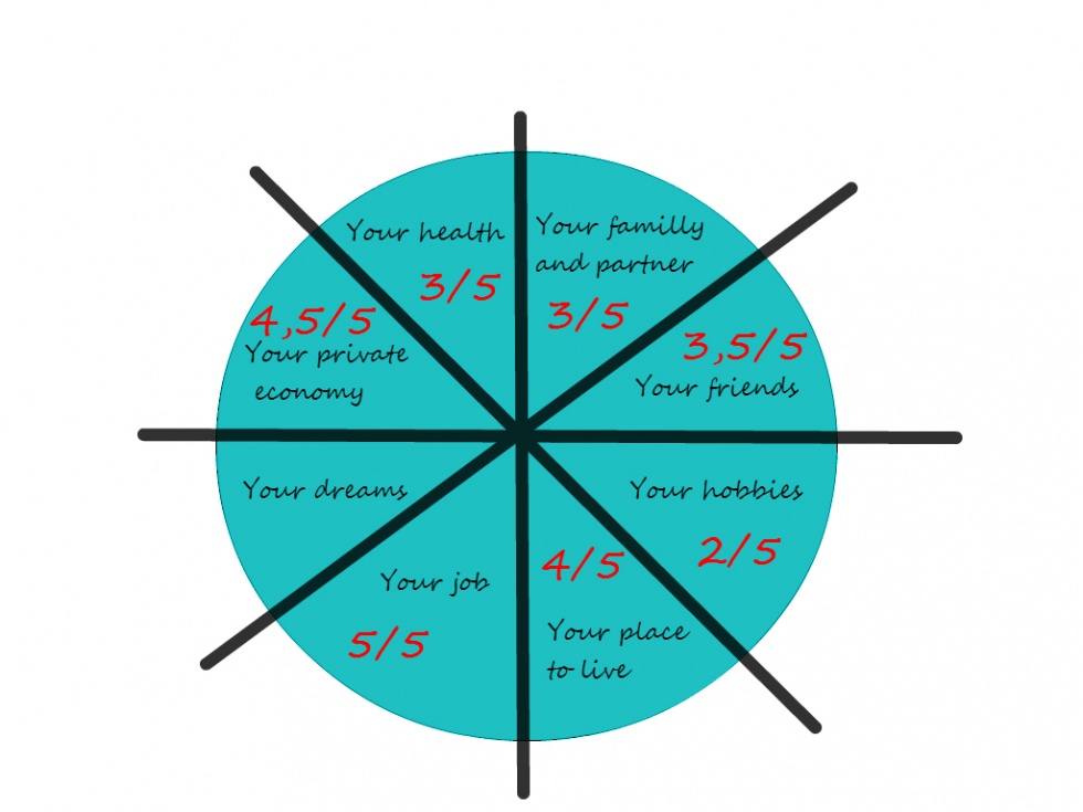The next step is to make a check about how every part of your cake is today and give them a grade, in comparison to the other parts of the cake. Let’s try with this example, inspired of my life, but not complete. I make it easy in order to give you the tip to begin your own wheel: