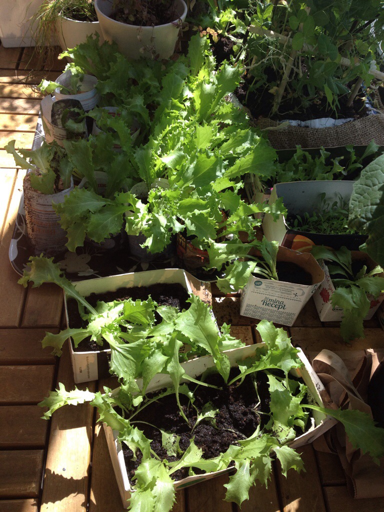 I am from the country side and living in a apartment is a pain during the spring for me. I want to plant, I want to have dirty hands. This year, I made an attempt. I have sawn a lots of salad, replanted them in paper home made gram and they are growing as hell!