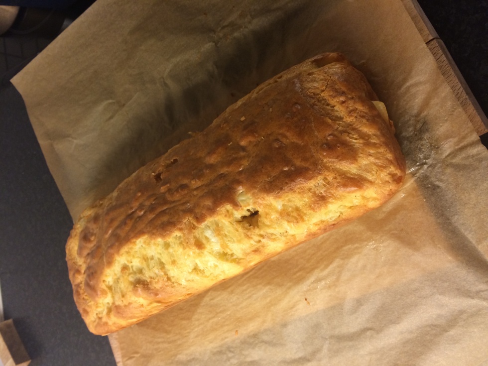 This is a very easy way to please my man: I take 3 eggs, 10 cl of oil, 12,5 cl of milk, 250 gr of flour and mix it together. Then, I put what I find in the fridge and this time, it was 3 sorts of cheese: mozarella, gruyère and feta.