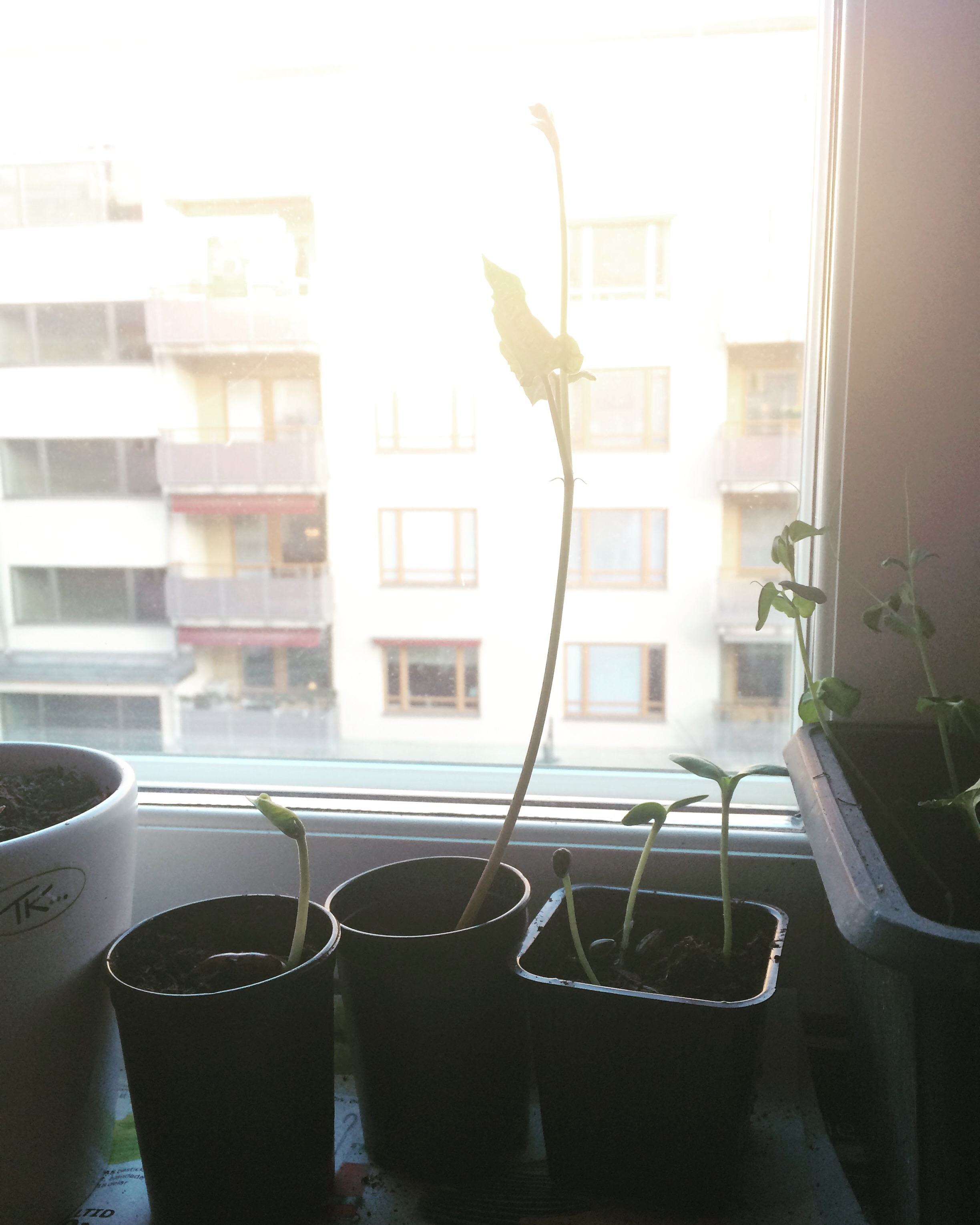 This little lurifax in the middle grows with maybe 5 cm every day. If I remember well, it will be flowers. The plan is to put them against the wall on our balcony but it is a way too early here, too cold at night.