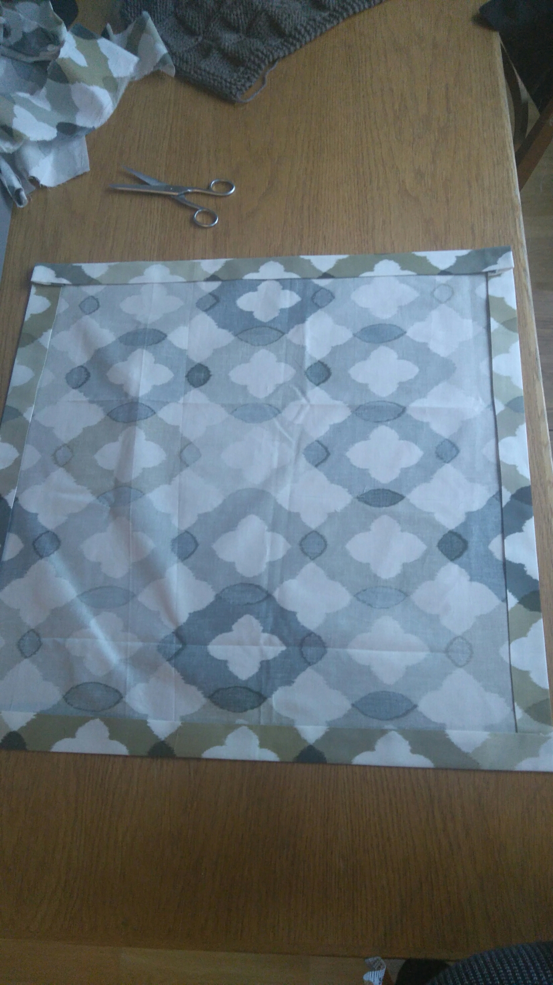 I began with measuring the blanket (I sticked until I did not have any whool left) and then I cut a piece of fabric larger with 4 cm on each side. I ironed the sides.