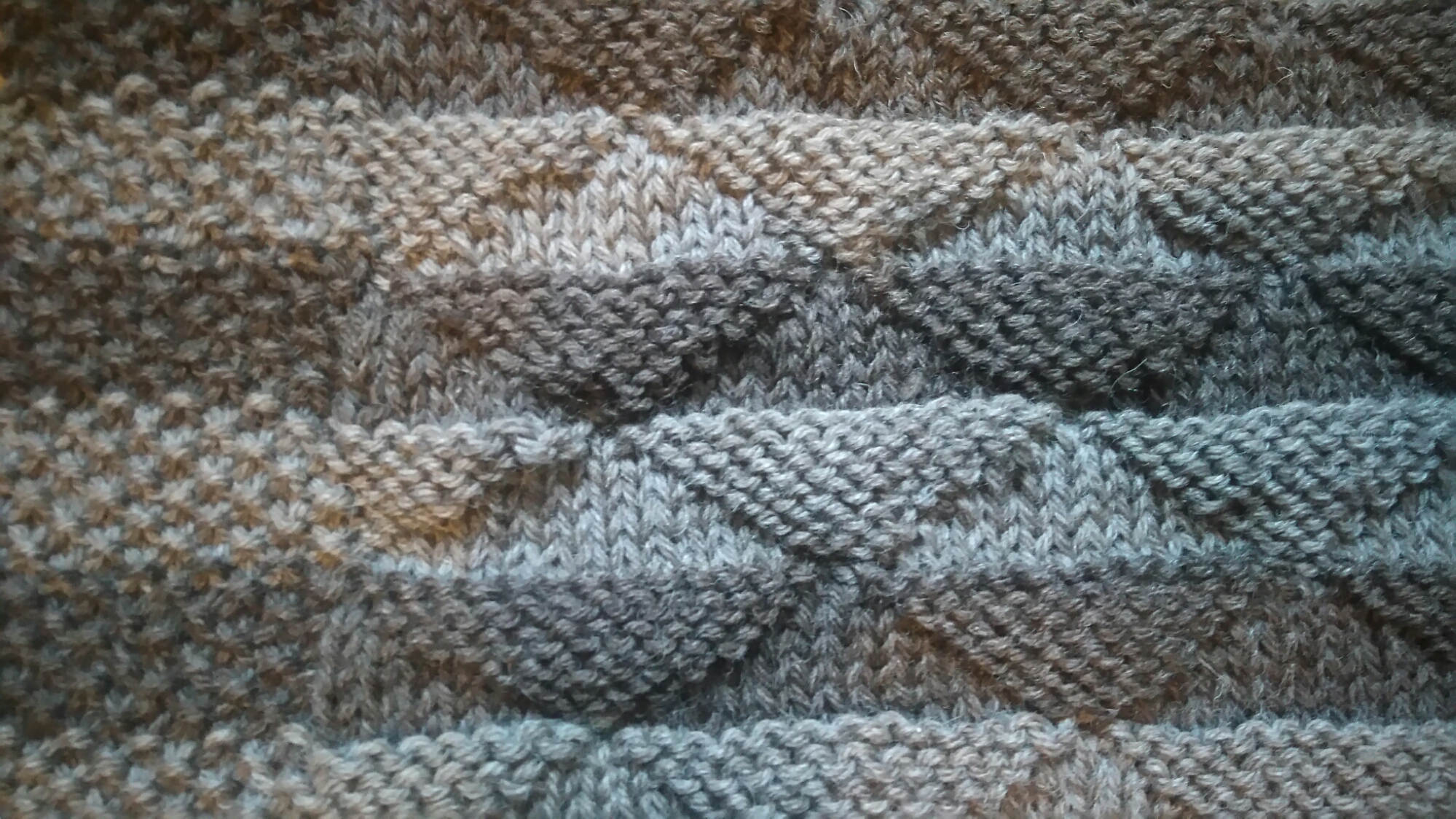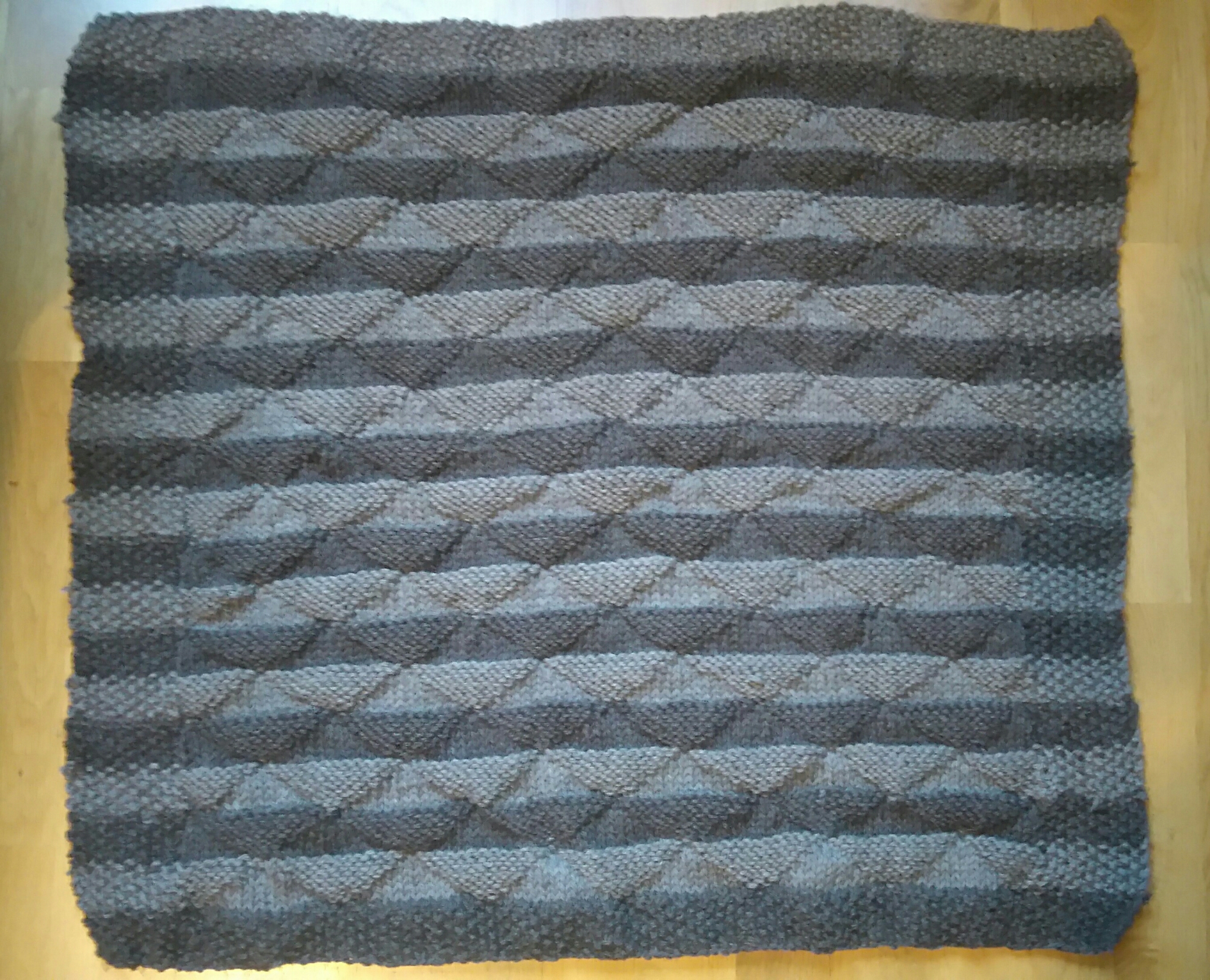 Then an alternance of knit stich and purl stich to build triangles, with the beginning and the end of every row knitted 11 plaited stiches.