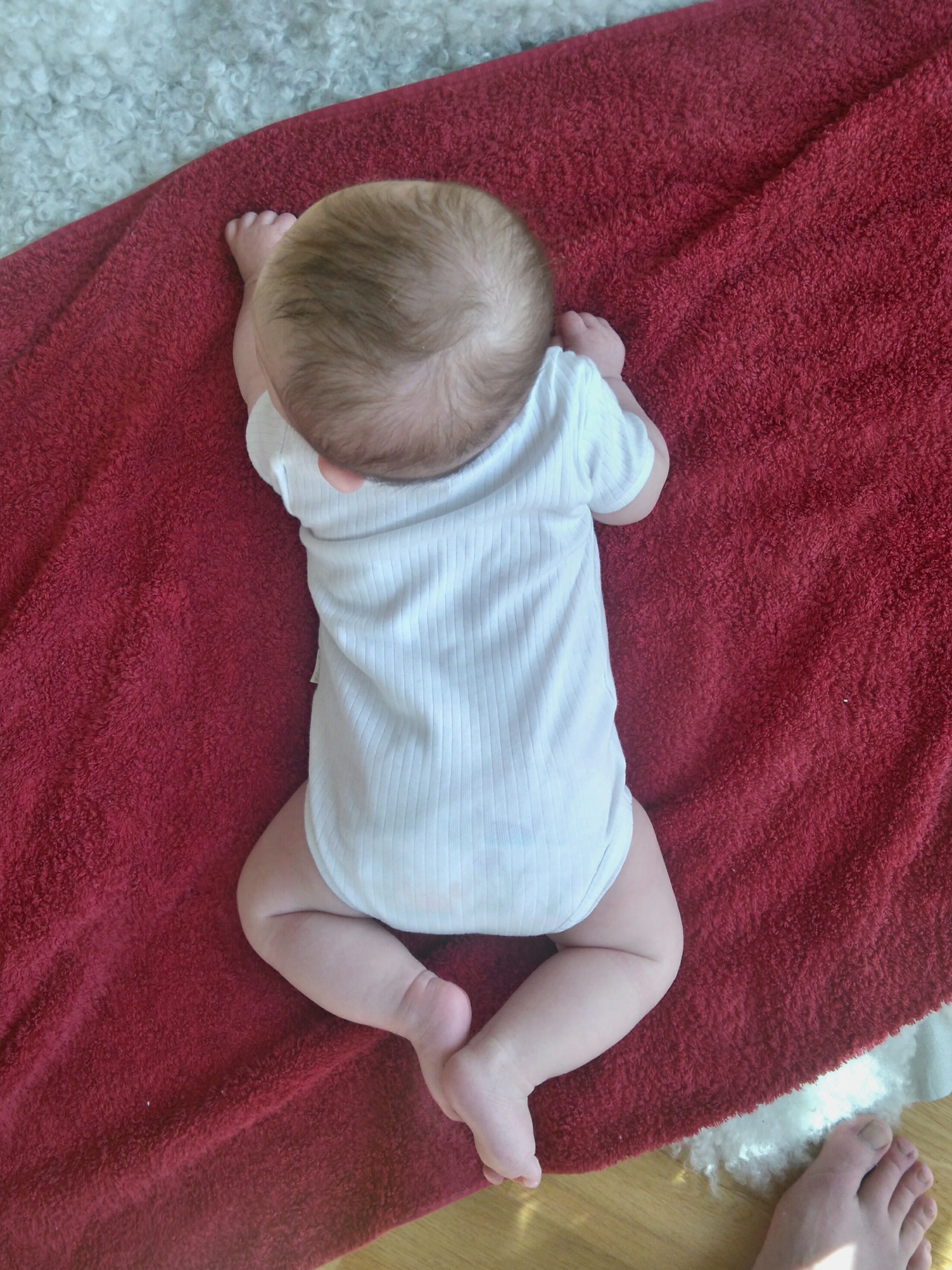 If I count well, our little girl is today 19 weeks. I stopped to count her age in weeks I’m noticing now. She is soooo big now! Yesterday, for the first time in her life, she had naked legs. It has been a very warm afternoon, a big contrast from the weather since she was born in January. Well, maybe it has been warm for the period of the year, but not enough to put these little legs out for too long.